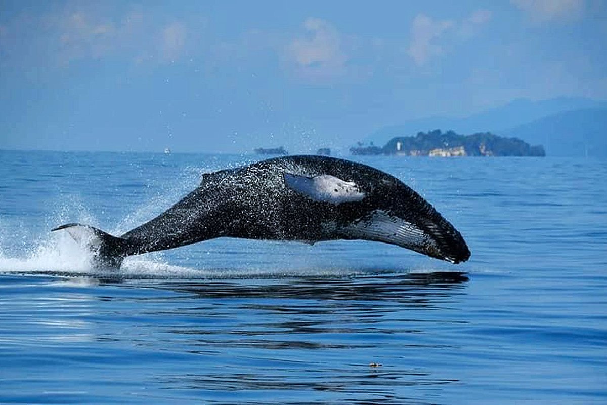 Salto de ballena jorobada en la bahía de Samaná (al fondo se ve la isla de Cayo Levantado).
